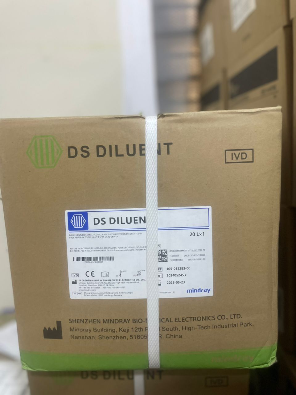 Mindray DS (EN/20L) — diluent solution for Mindray haematology analysers. Isotonic diluent used for sample dilution in CBC (complete blood count) analysis. Maintains cell integrity during measurement. Content: 20 L.