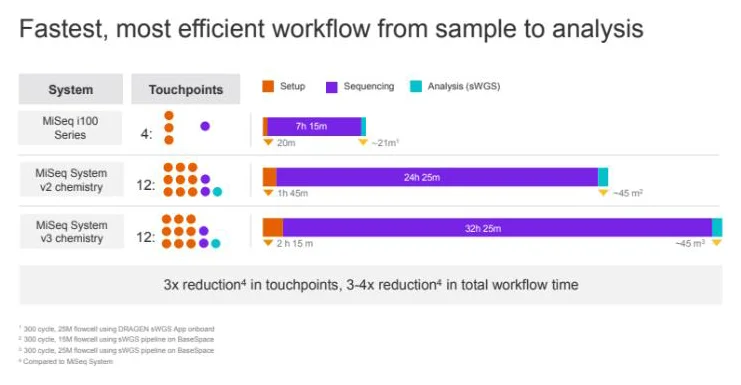 The Miseq i100 series offers a three-step setup, onboard cluster generation and onboard denaturation; no post-run washes; sample-to-analysis workflows with onboard DRAGENTM analysis