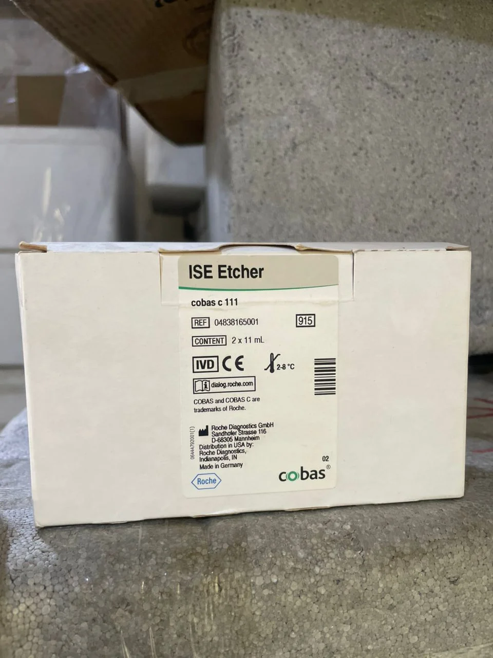 ISE Etcher — cleaning solution for the ion-selective sodium electrode on the cobas c 111 ISE module. Used during the ‘Electrode Service’ maintenance routine alongside the Activator and Deproteinizer to ensure consistent electrode performance, accurate calibration, and reliable electrolyte results. Content: 2 × 11 mL.